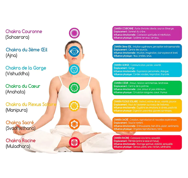 Les émotions, la santé physique et mentale, entre autres, peuvent influencer le fonctionnement des chakras. Ils se situent depuis la base de la colonne vertébrale jusqu’au sommet de la tête :